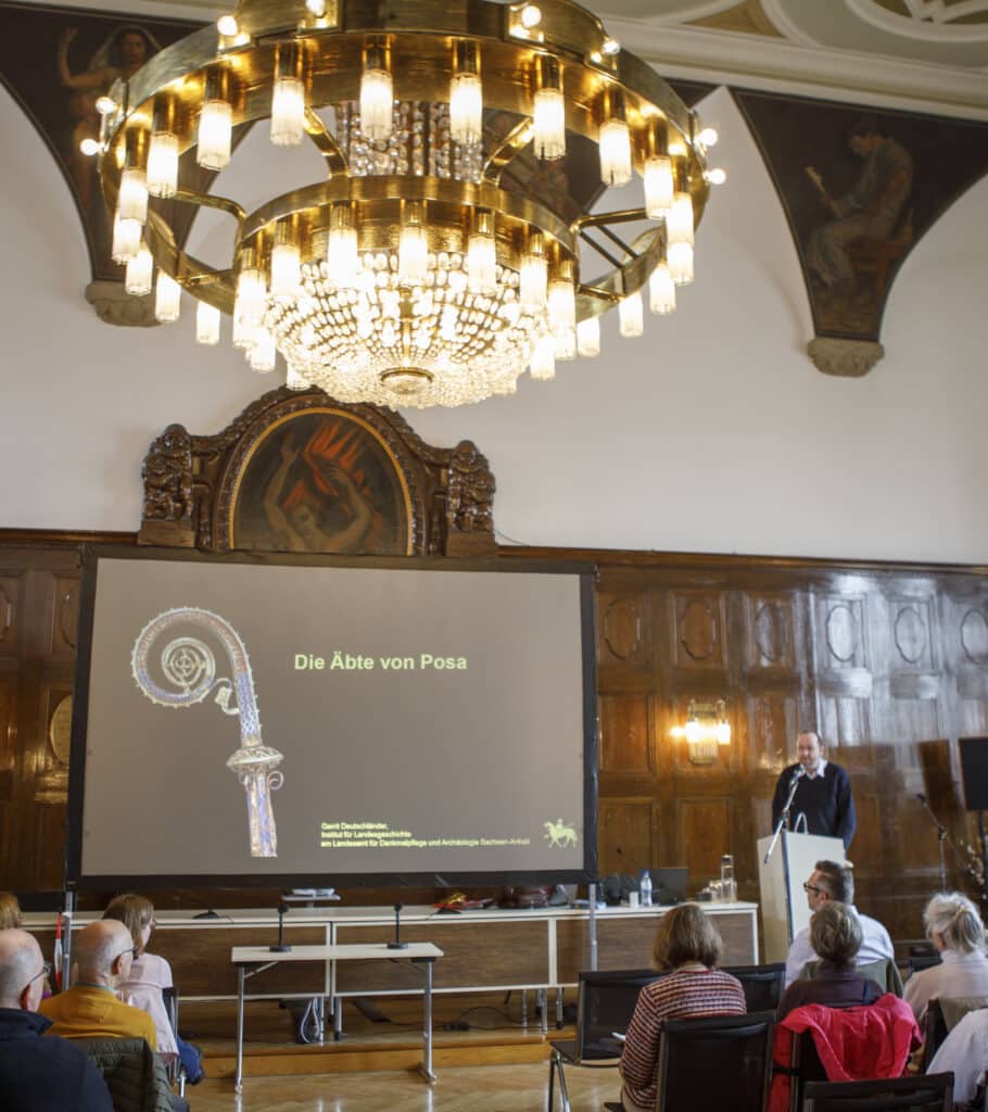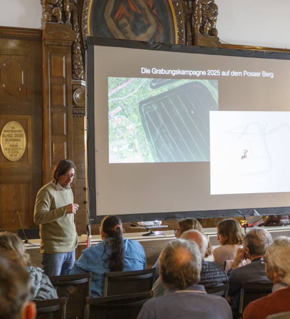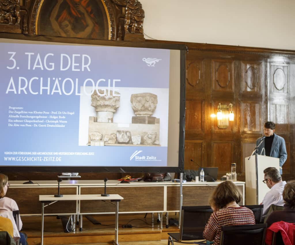 Am 21. März fand im Friedenssaal des Zeitzer Rathauses unser 3. Tag der Archäologie statt. 50 Besucherinnen und Besucher nutzten die Gelegenheit, Einblicke in unsere aktuelle Forschungsarbeit und die Grabungen auf dem Klosterberg Posa zu gewinnen.